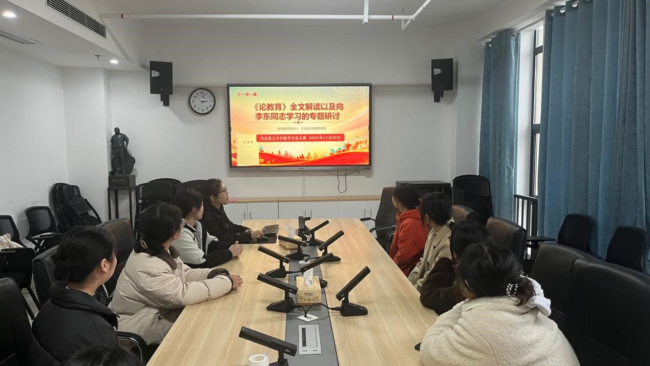 为深入学习贯彻党的教育方针,全面学习领会习近平总书记关于教育的重要论述,11月20日下午,伟德国际1946学生党支部组织全体党员及预备党员在百熙楼1010会议室开展题为“《论教育》全文解读以及向李东同志学习的专题研讨”的“一课”学习活动,本次主题党课由党务办工作办公室主任黎秀文主讲。