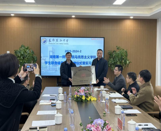 王竹苗副院长和宋徽瑾、吴承富老师以及20思政1班11名实习生参加会议,长郡麓谷中学李望雄校长、张波男副校长、伍先华副校长、全体行政干部、年级组长、实习指导老师参加会议。