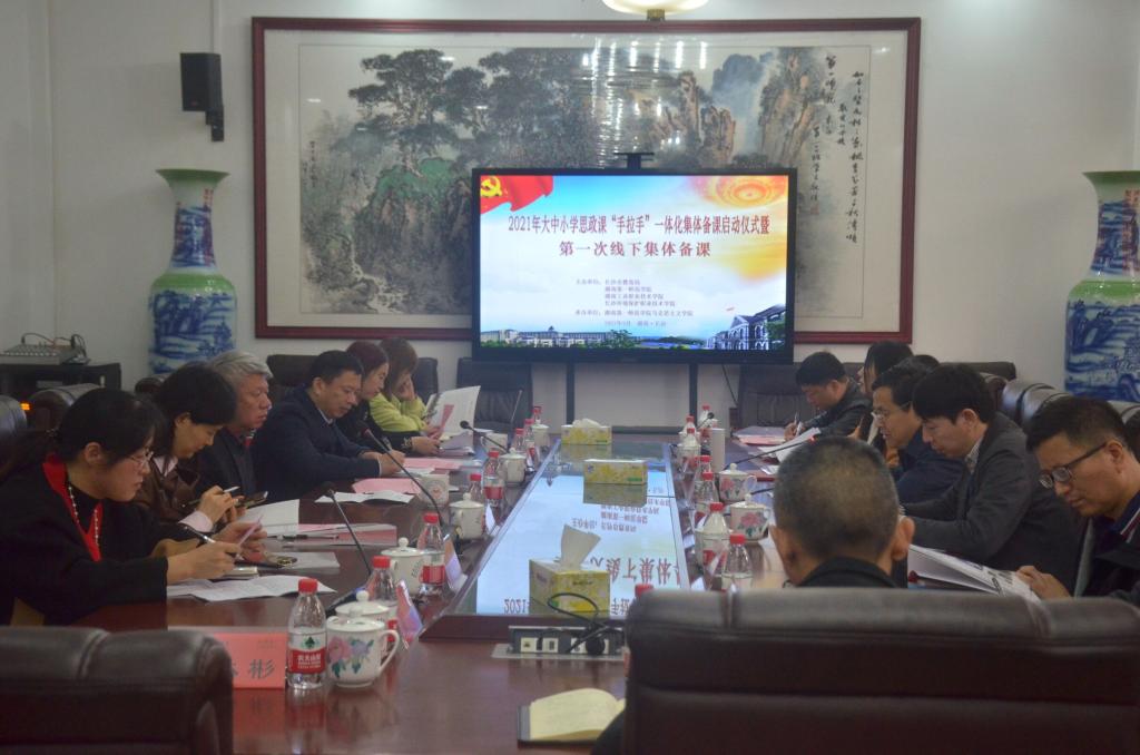 为深入学习贯彻习近平总书记在学校思想政治理论课教师座谈会上的重要讲话精神,大力推进我省大中小学思政课一体化建设,切实提升思政课教学质量,3月30日,我校联合长沙市教育局、湖南工业职业技术学院、长沙环境保护职业技术学院共同举办2021年大中小学思想政治理论课“手拉手”一体化集体备课启动仪式暨第一次线下集体备课会。我校副校长江正云、教务处处长蒋蓉、伟德国际1946党总支书记欧阳斐,长沙市教育科学研究院党委书记胡志豪以及湖南工业职业技术学院伟德国际1946院长苏茂芳、长沙环境保护职业技术学院思政部主任曹珍等领导出席活动。启动仪式由欧阳斐主持,第一次线下集体备课会由苏茂芳主持。