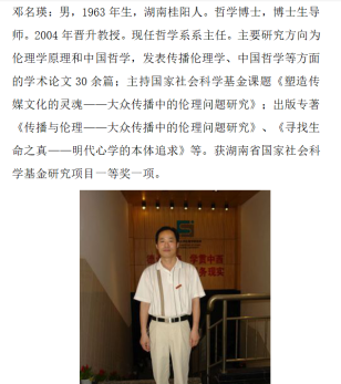 邓名瑛教授,湖南师范大学道德文化研究院教授,博士生导师,湖南师范大学公共管理学院系主任,教育部社科重点研究基地湖南师范大学道德文化研究中心研究员,出版多部著作,发表学术论文数十篇。