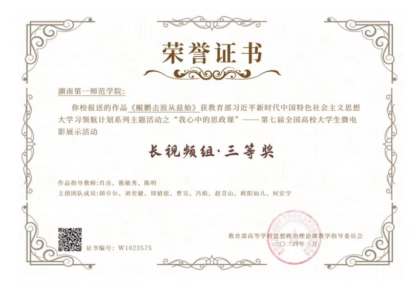 微电影《鲲鹏击浪从兹始》由教师肖彦、熊敏秀、陈明指导,胡卓尔、刘奕婕、周婧依等同学参与拍摄,作品讲述了一名师范生从迷茫中逐渐找到奋斗方向,立志实现教育强国梦,成为具有“教育家精神”教师的故事,生动展现了青年学生在新时代背景下勇担历史重任、积极投身社会实践的精神风貌。