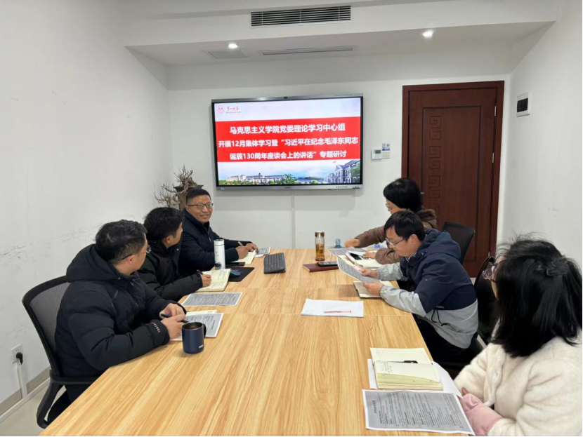 12月29日,我院党委理论学习中心组开展12月集体学习暨“习近平在纪念毛泽东同志诞辰130周年座谈会上的讲话”专题研讨。院党委书记阮东彪主持并总结讲话,学院党委委员出席,综合办主任列席会议。