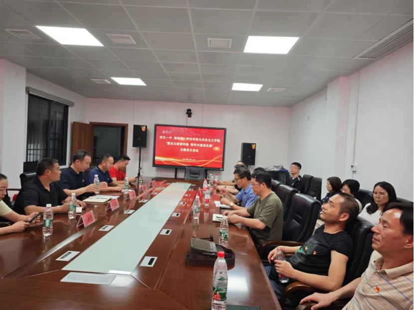 随后,同志们来到了安化一中,参观了青年毛泽东游学纪念馆。安化一中是青年毛泽东1917年游学时的重要一站,毛泽东曾经住宿安化一中校园内的文庙。1925年毛泽东第二次来安化,开展农民运动考察。同志们重温了青年毛泽东游学和参加革命的历史,对毛泽东展现的重视调查研究、实事求是精神深深折服。随后,在党委书记阮东彪的带领下,我院党委与安化一中党总支举行联合党建活动。安化一中党委副书记副校长李远喜、学生处主任周吉龙、文武庙中心主任何建勋、学生处副主任程文倡、团委副书记刘林艳和欧铭聪、侯文静等党员教师出席活动。首先,在安化一中同志们的陪同下,我们参观了安化一中校园内的孔庙、青年毛泽东游学纪念馆。随后,在学校图书馆二楼会议室召开座谈会。李远喜致欢迎辞、介绍安化一中校馆建设情况。阮东彪介绍我校我院基本情况,强调了习近平总书记考察我校重要讲话精神以及我院党建特色,畅谈了联合党建的设想。周吉龙介绍了学校党建带团建及利用教育场馆开展德育活动情况。我院副院长王竹苗介绍课程育人情况,党员教授代表贺汉魂突出强调了大学与中学联合党建的必要性。
