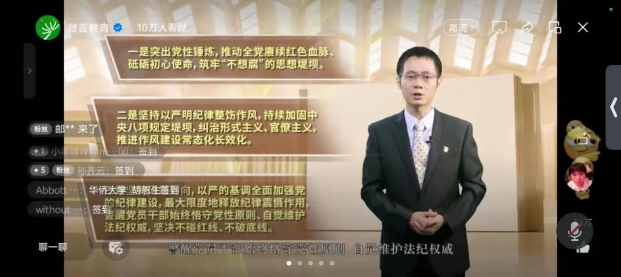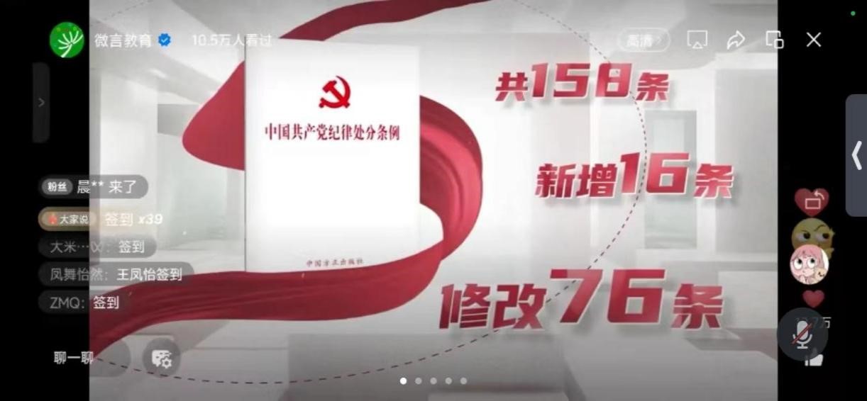 本次微党课由中国政法大学、中南财经政法大学、西南政法大学、西北政法大学的党员干部师生联袂讲授,讲师们深入浅出地对《条例》的修订背景、历史沿革和重要意义等总则内容进行整体解读,同时结合典型案例以案释法、以案促学,以案明纪,使我们全体观众受警醒、明底线、知敬畏,切实掌握政治纪律、组织纪律、廉洁纪律、群众纪律、工作纪律、生活纪律的主旨要义和规定要求。