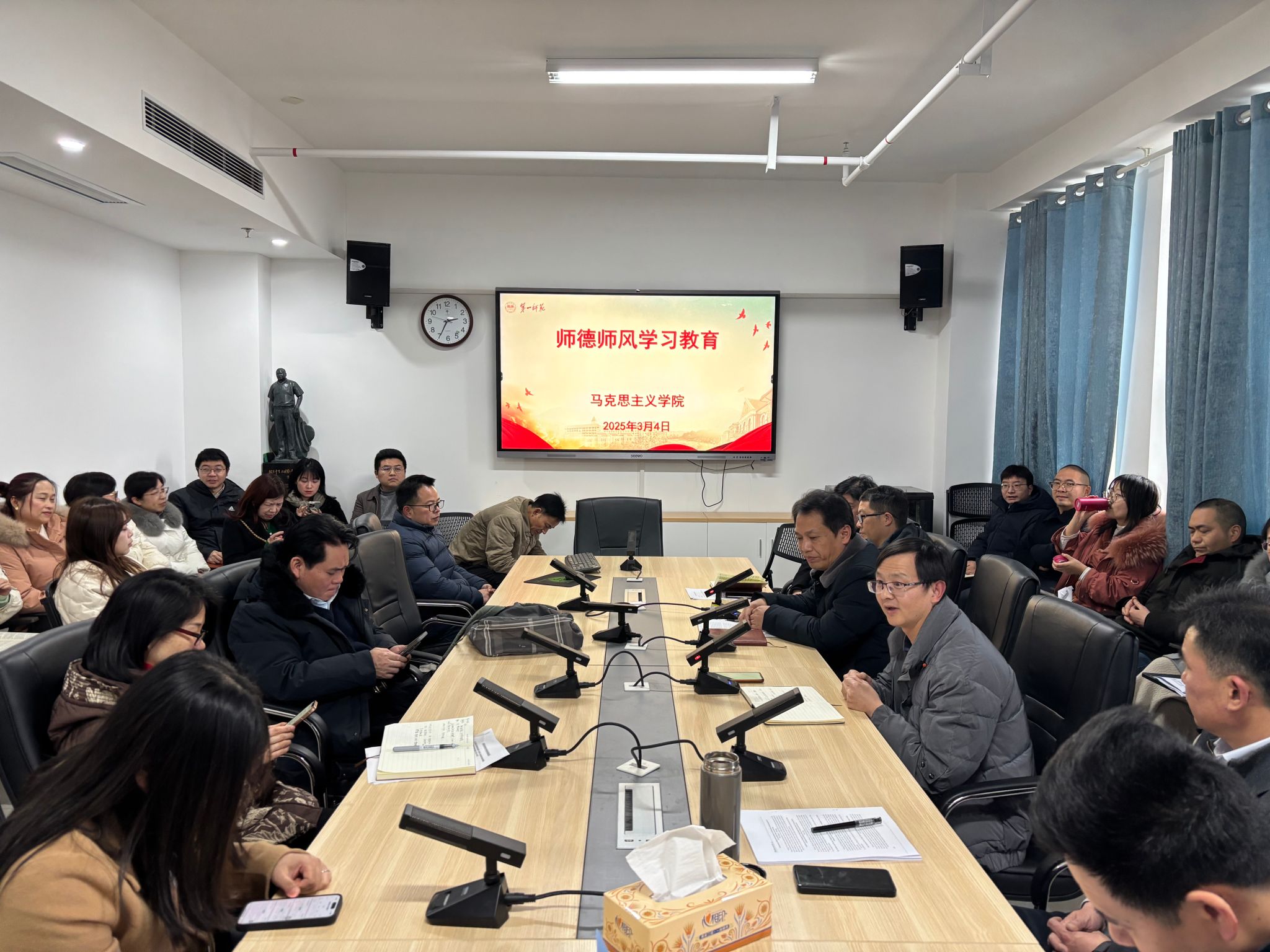 此次会议以“守初心 铸师魂 育新人”为主题,通过政策学习、案例警示、经验交流三大环节展开。曾玉华书记系统领学了《新时代高校思想政治理论课教师行为规范和准则》《教育部关于建立健全高校师德建设长效机制的意见》等文件,并结合某高校教师违反课堂政治纪律、某科研团队数据造假等典型案例开展警示教育。他强调,思政课教师必须对标“政治要强、情怀要深、思维要新、视野要广、自律要严、人格要正”的“六个要”标准,将师德要求贯穿教育教学全过程。