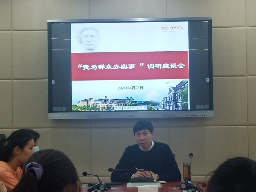 4月28日,院党总支书记欧阳斐在润寰北205会议室召开党史教育“我为群众办实事”调研座谈会,各班代表参加本次调研座谈会。