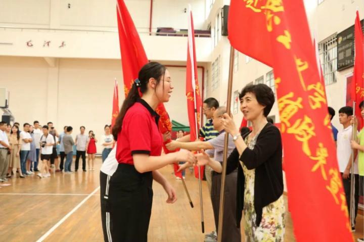 活动第一项,全体起立,奏唱国歌。紧接着,由三位校领导向各三下乡社会实践团队进行授旗仪式,我院三下乡团队代表刘梦娟同学从校长童小娇教授手中郑重地接过马院三下乡团队的队旗,并与童校长亲切握手。随后,“三下乡”社会实践活动学生代表文传院易诺同学和指导教师代表商学院禹晗老师先后上台发言,学生工作部陈志武部长重点宣讲了2019年“资助政策下乡行”相关要求,校长童小娇教授作重要讲话,对全校的三下乡社会实践团队提出了新的要求和希冀,而后在一阵热烈的掌声中,校党委书记彭小奇教授宣布我校2019年大学生暑期”三下乡“社会实践活动正式启动。