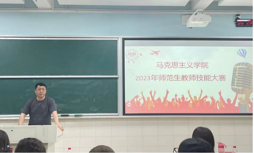 为深入贯彻落实党的二十大精神,积极响应湖南省教育厅主办的“湖南省普通高等学校师范生教学技能竞赛”活动,进一步强化我院学生的教师职业技能,提升立德树人本领,4月21日下午,我院在怀中南102教室开展师范生教学技能竞赛复赛。本次比赛邀请学院王竹苗副院长、杨秀云老师、李红雁老师担任评委,数十名马院同学自发到现场观摩学习。