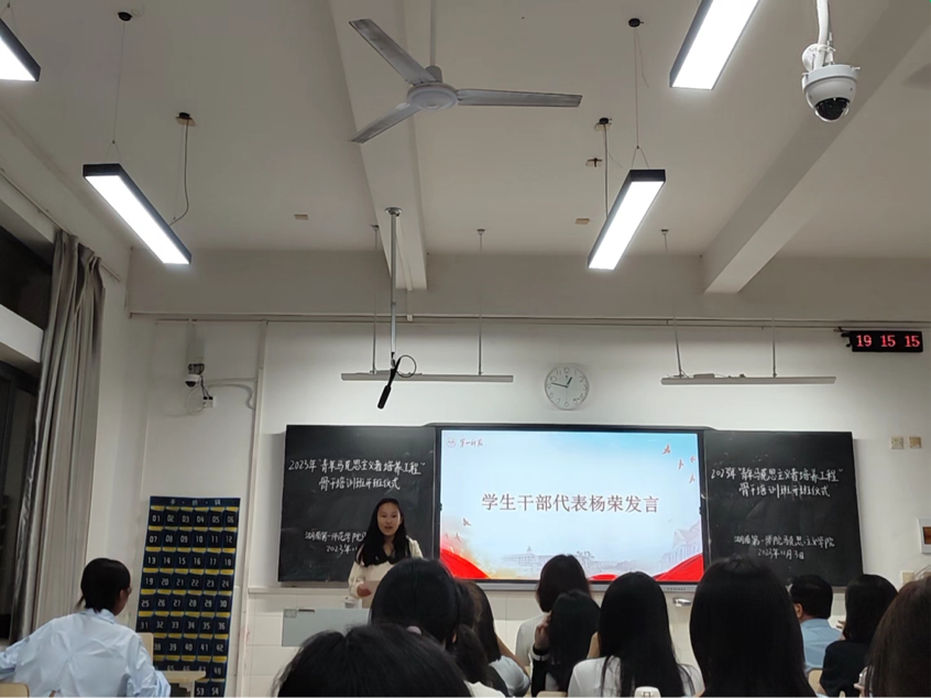 仪式第四项是学生干部代表发言。分团委学生副书记杨荣作为学生干部代表发言,她围绕青年大学生的使命与责任,立足我们的实际情况,为学员们分享了心得体会和工作经验。