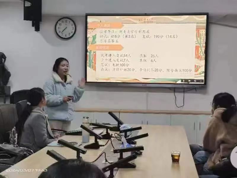 会议伊始,刘艳霓介绍了与会的2023届考研学生代表,并对她们的到来表示热烈欢迎。会上,就读于华中师范大学的夏晶晶同学从不同维度对复试准备进行了经验分享,指出要根据复试公告获取复试要求,还要关注社会热点,及时了解报考院校导师研究方向。就读于湖南大学的邓思同学从复试准备、复试模拟、复试实践以及思政前沿四个方面进行了详细解读,她强调,一定要根据复试大纲规划备考时间和重点,牢牢掌握思政相关前沿热点知识,通过复试模拟不断提高应试能力。随后,谭唯、屈佳雨和朱继顺等三位同学则结合今年的考研形势和个人体会,分别从复试前准备、笔试、面试、调剂和心态调整等几个方面为在座的同学们提出了宝贵建议。