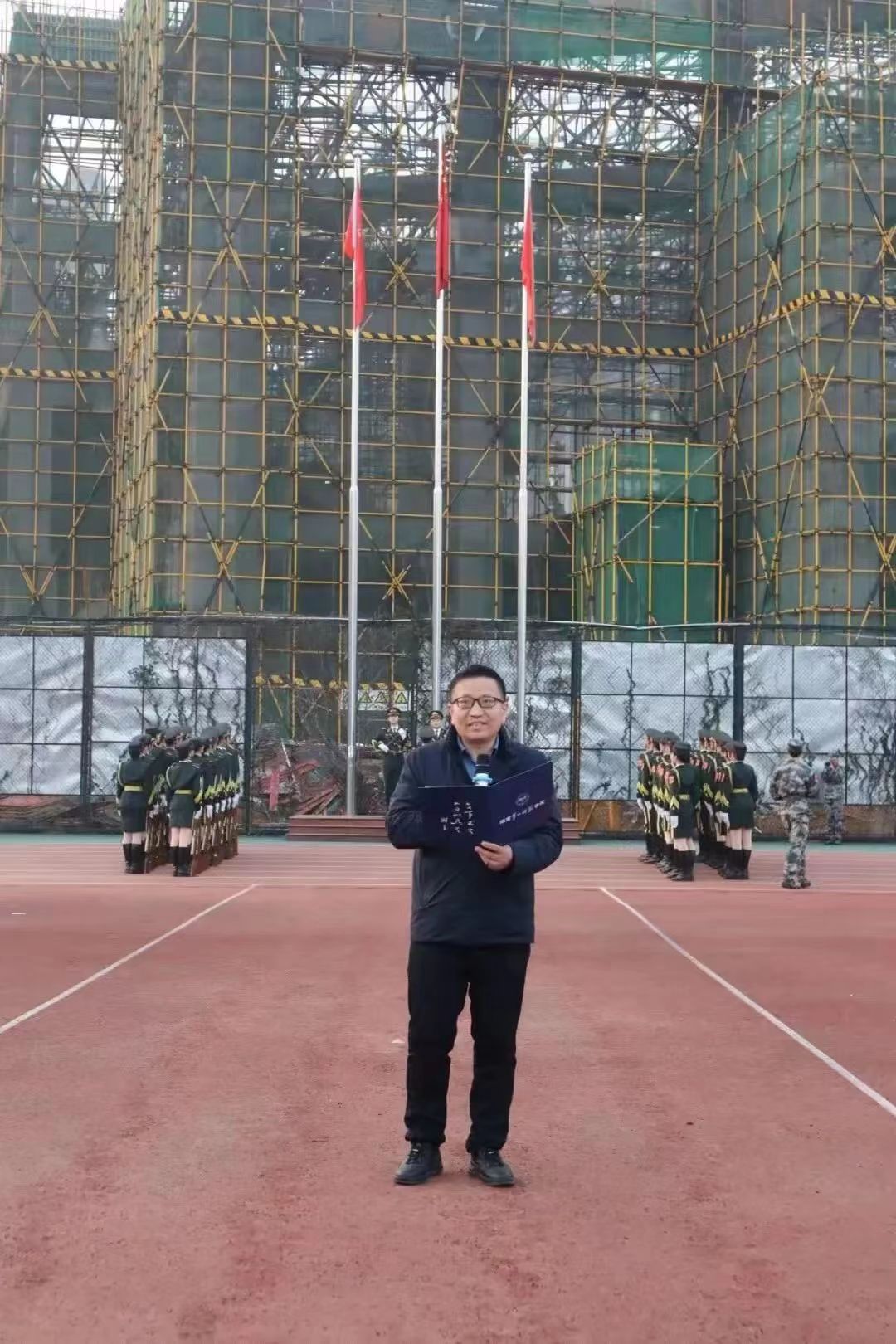 春风拂面,晨曦微露。早晨六点四十,全体马院学子已早早来到操场集合,井然有序的在操场上列队。升旗仪式正式开始,胡英书记致开场词、介绍参加仪式人员后,在全体师生的注目礼下,英姿飒爽的国旗护卫队队员迈着铿锵有力的步伐,护送着鲜艳的五星红旗进场来到国旗台前。伴随着嘹亮的国歌声,五星红旗冉冉升起