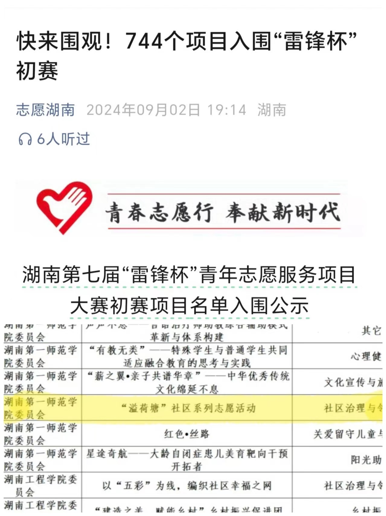 2024年9月3日,志愿湖南公众号发布湖南省第七届“雷锋杯”青年志愿服务项目大赛初赛项目名单,我院 “溢荷塘”社区系列志愿服务项目成功入围。