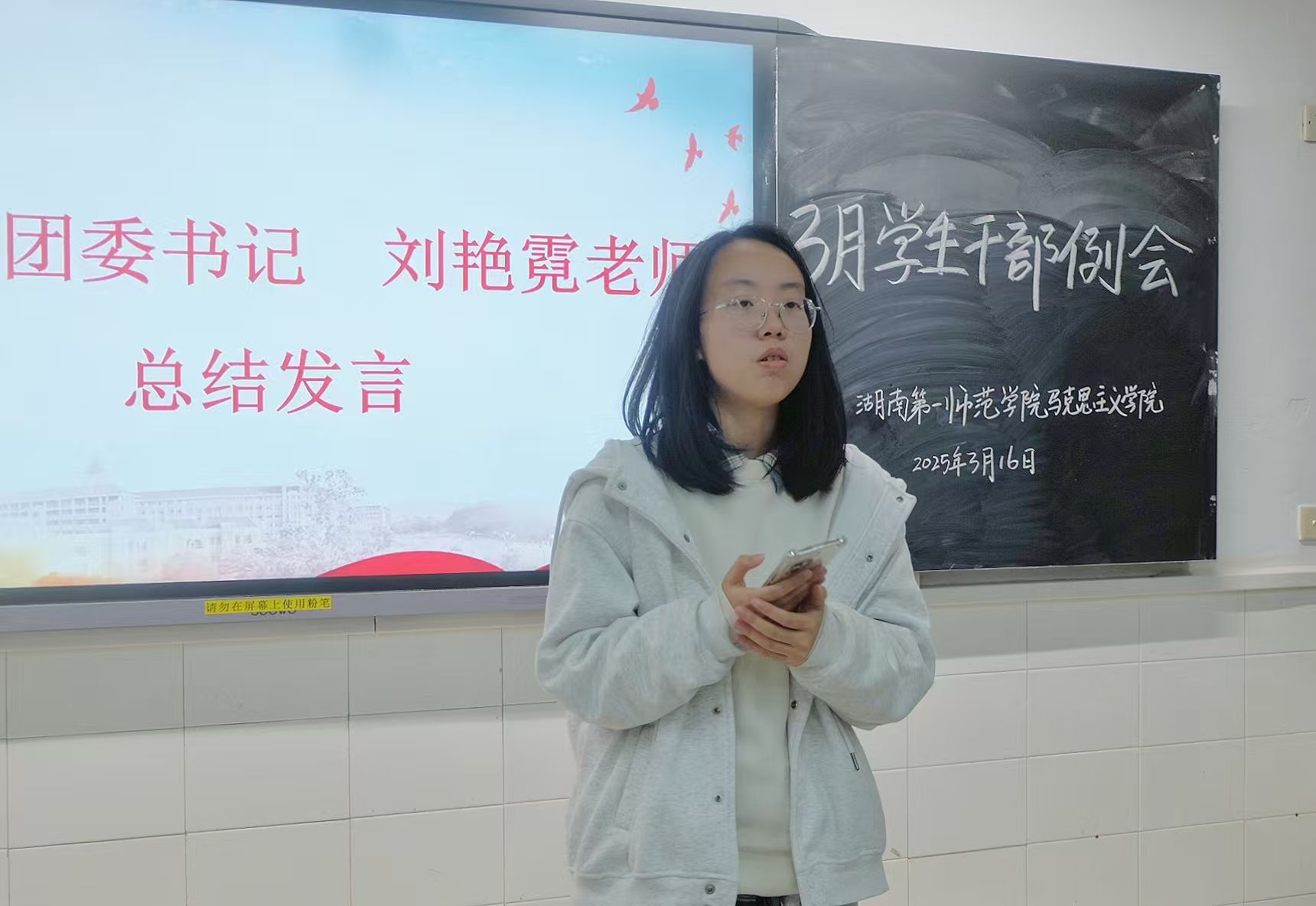为强化学生干部队伍建设,推动团学工作创新发展,3月16日晚,伟德国际1946在润寰北304教室举行新学期学生干部会议。会议以“传递学生干部接力棒”为主题,分团委书记刘艳霓出席,学院2024-2025届全体学生干部参会,24 级思政5班张娇若担任主持。
