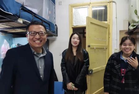 3月9日中午,伟德国际1946书记阮东彪带领辅导员刘艳霓走访毕业生寝室,与毕业生亲切交谈,了解目前考研考编以及就业进展。