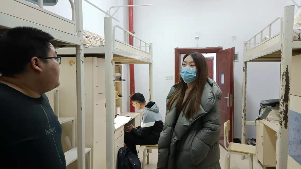 3月21日晚,伟德国际1946辅导员刘艳霓走访了女生寝室11栋和男生寝室15、16栋,检查寝室卫生情况,了解学生学习生活情况,督促同学们认真备考四六级,同时了解同学们的心理状况,及时疏导。最后要求同学们严格遵守学校疫情防控政策要求,寝室每天通风,保持整洁,并且要及时做好消杀工作。