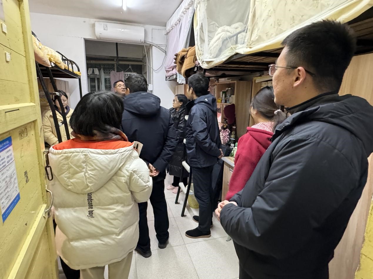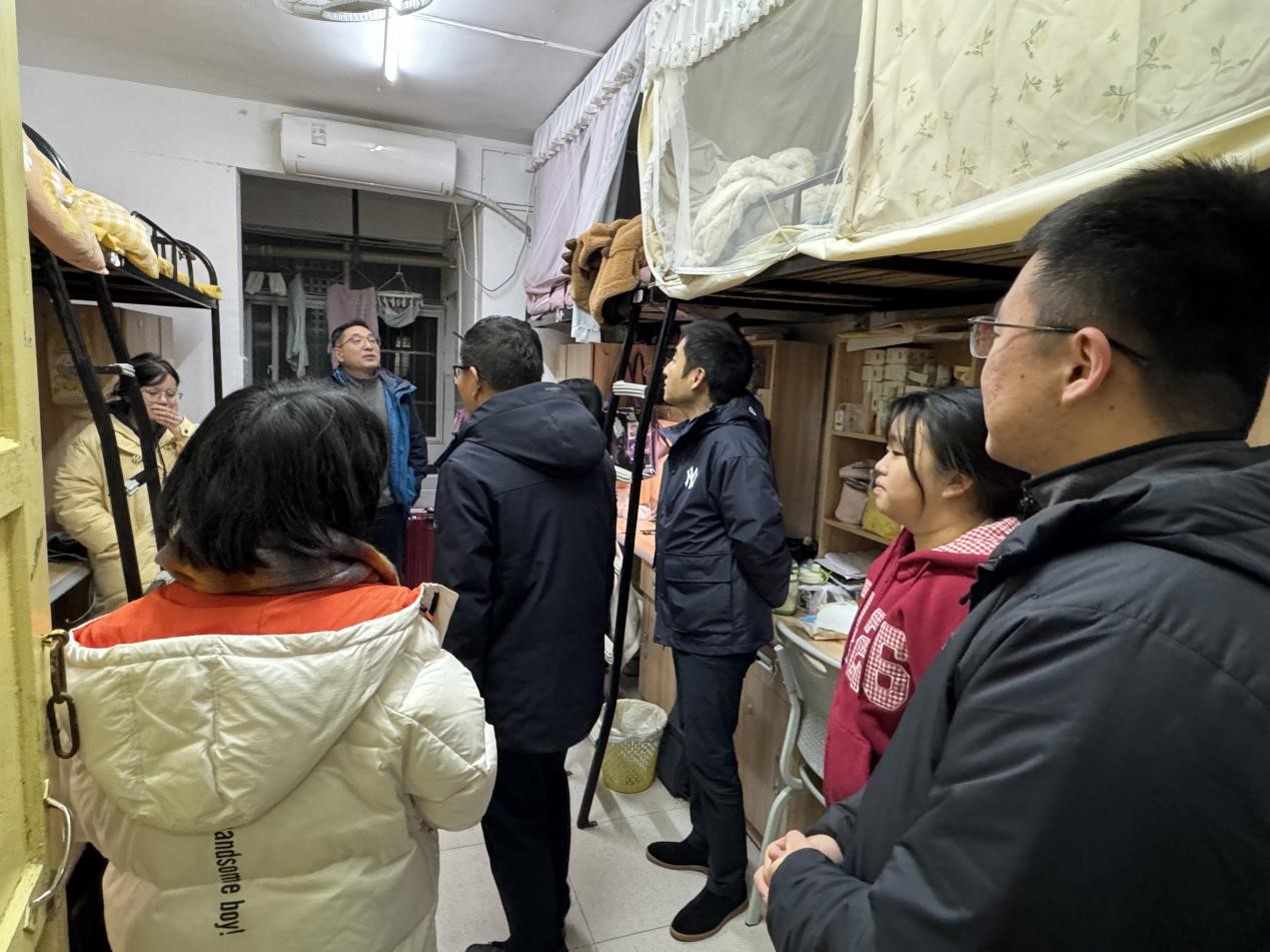 12月23日,学工部部长周大庆,伟德国际1946党委书记阮东彪,学工办主任于澎带领辅导员深入学生宿舍走访,关心学生期末备考情况,鼓励同学们向优秀学长学姐看齐,学习备考经验、提高备考效率。并提醒同学们预防冬日火灾,避免使用大功率电器与易燃物品,共同维护宿舍安全,打造安全健康的生活环境、学习环境。