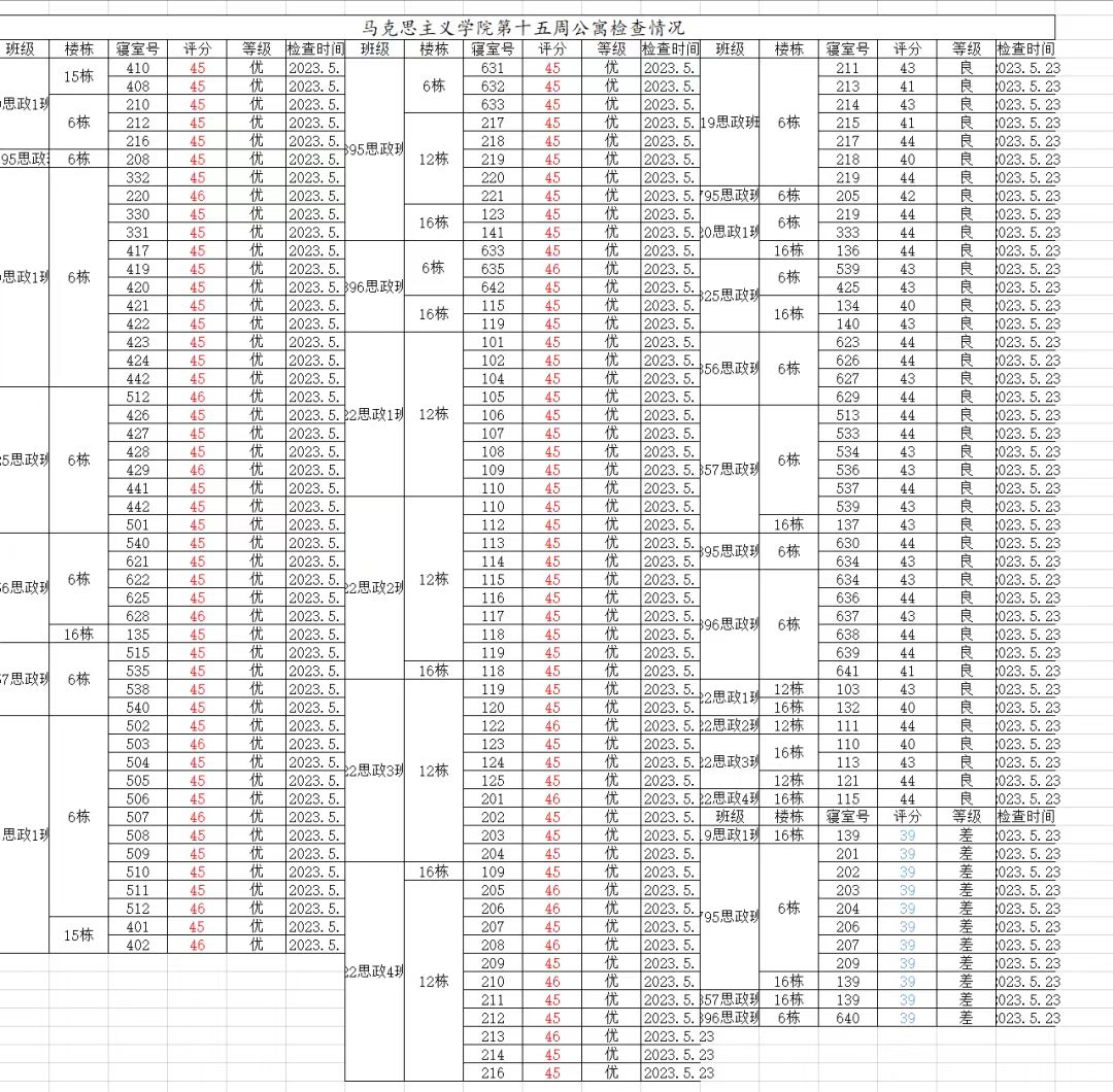 宿舍既是同学们生活,学习,休息的地方,又是学生交流思想,培养综合素质的重要活动场所。为了同学们有个良好的宿舍环境,学校认真严抓的,在此希望每位同学都能认真打扫好寝室卫生,以下就是第十五周公寓检查基本情况: