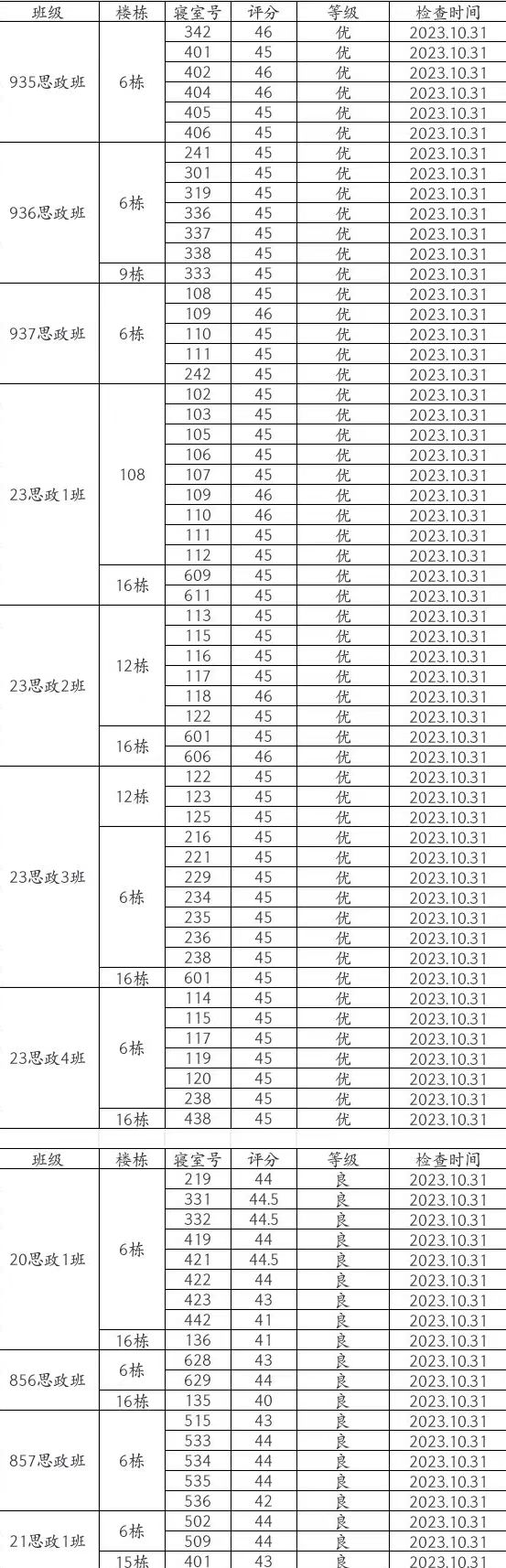 总结:本周卫生大检优寝比率较之前有所提高,总体表现中等。其中937思政班与23思政1班混寝16-615(杨程、李书畅、陈国颖、全启航)、23思政3班与23思政4班混寝16-439(唐慕逍、张耿荣、周顺翔、周家利)、856思政班6-627(刘书筠、邓利菲、李欣悦、郭斯颖)、857思政班6-539(吴牧宁、李菁、唐小蕾)、857思政班16-137(丁嘉豪、周靖浩、符灿宇、田畅轩)、857思政班16-139(胡佳骏)、896思政班6-639(雷丽萍、袁雅琴、杨雪琴、肖子怡)、936思政班16-619(李中翰、何泳先、陈龙云、陆琦)、23思政4班6-239(黄静仪、汪红玉、曾紫洋、唐琼玥)等宿舍仍需继续改进!希望大家共同努力,建设文明美丽公寓!