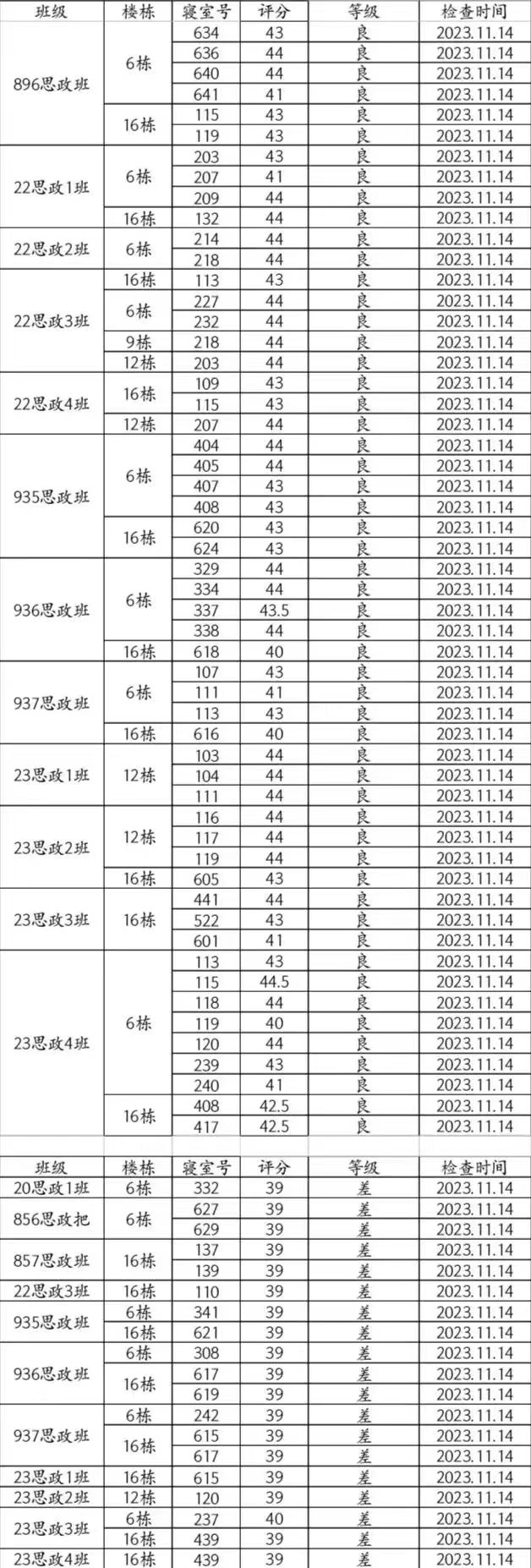总结:本周卫生检查情况总体表现中等,其中856思政班6-627(刘书筠、邓利菲、李欣悦、郭斯颖)与6-629(谢美琳、何雪玉、兰星宇、余敏)、857思政班16-137(丁嘉豪、周靖浩、符灿宇、田畅轩)、22思政3班16-110(王鸿宇、高睦涵、向成林、赵嘉豪)、23思政3班6-237(林涵萱、王凤麟、赖语婷、王耀)、23思政3班与23思政4班混寝16-439(唐慕逍、张耿荣、周顺翔、周家利)等宿舍卫生情况较差,仍需继续改进。希望大家共同努力,建立文明美丽清洁宿舍!