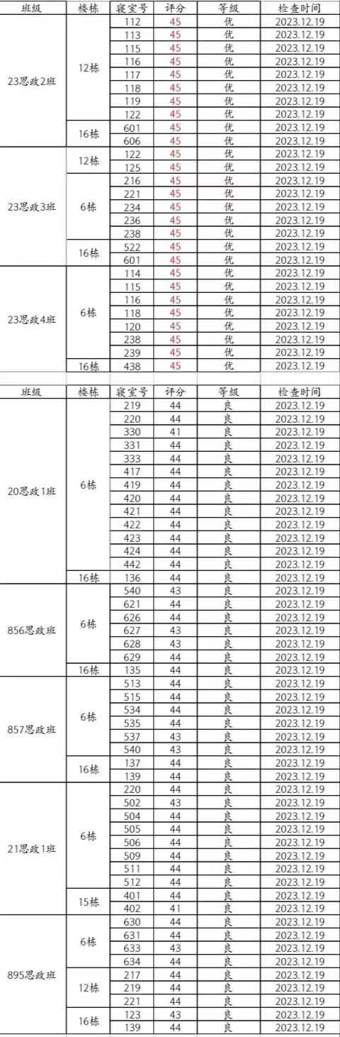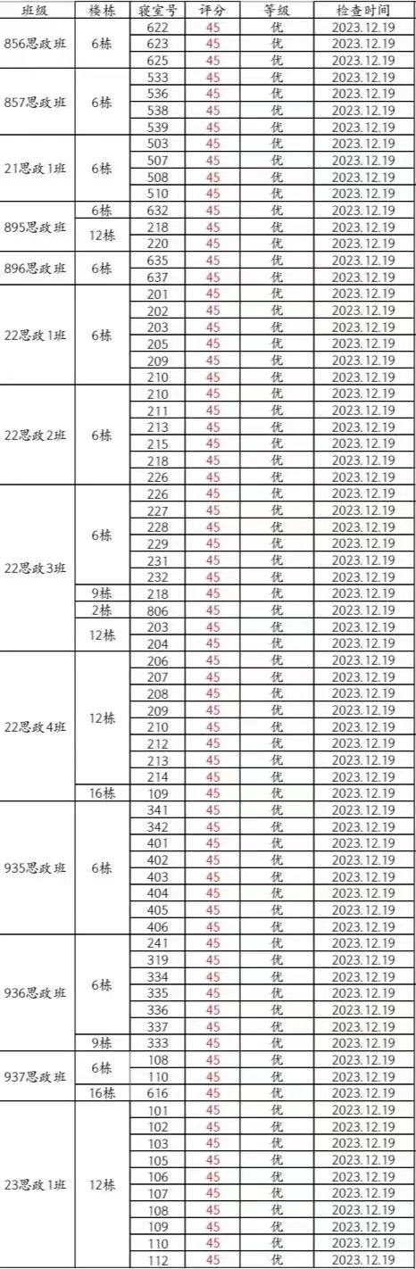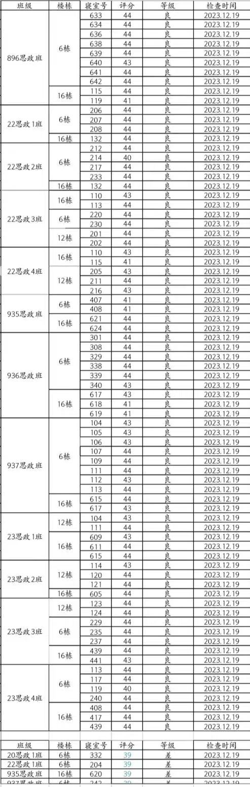 本周卫生大检优寝比率较之前有明显提高,总体表现良好。其中935思政班16-620(邓戴维、官宪律、李天德、胡惟方)、937思政班6-242(万源源)、22思政1班6-204(万湘、高浏乐、王思钰、吴欢)、20思政1班6-332(李馥君、张嘉怡、宋维佳、曾艳芳)等宿舍仍需继续改进!希望大家共同努力!