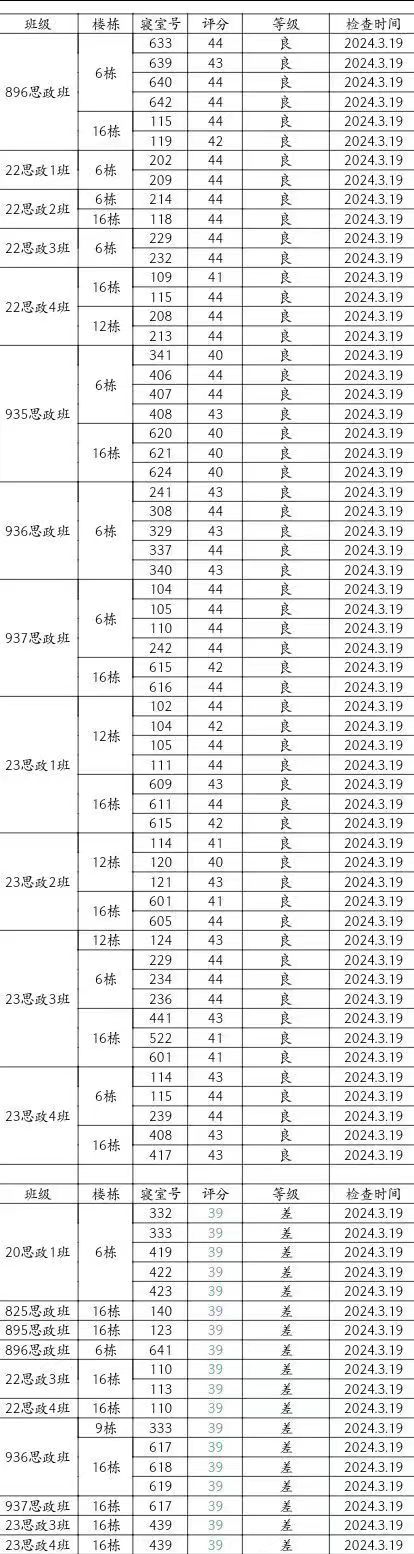 本周卫生检查情况较好,但20思政1班6-332(李馥君、张嘉怡、宋维佳、曾艳芳)、825思政班16-140(左东、吴耀轩、唐振武、徐荷羽)、895思政班16-123(曹昊、胡搏奥、陈海川、周建波)、896思政班6-641(芦艺丹、陈萝玥、谭佳、雷奕林)等宿舍仍需继续改进!希望大家共同努力,建设文明美丽宿舍!