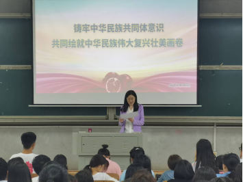 5月9日晚,副校长蒋蓉为教育学院、物理与化学学院、外国语学院等五个学院21级学生讲述一堂主题为“铸牢中华民族共同体意识 共同绘就中华民族伟大复兴壮美画卷”的形式与政策课程,带领学生深刻了解习近平总书记关于加强和改进民族工作的重要思想,深入浅出,环环相扣,将铸牢中华民族共同体意识潜移默化地嵌入每一位学生的心中,融入血液里。
