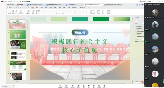 刘慧芳、吴红分享了教材第四章第二节《社会主义核心价值观的显著特征》、第三节《积极践行社会主义核心价值观》的备课成果。刘慧芳从先进性、人民性、真实性三个角度,讲述了社会主义核心价值观的显著特征。展示过程中,刘慧芳从人类社会发展规律、中国百年的历史巨变,揭示了社会主义核心价值观的先进性;从尊重人民的历史主体地位、以人民为中心的价值取向揭示了核心价值观的人民性;从社会主义国家和人民的实践,揭示了社会主义核心价值观的真实性,揭露了西方普世价值观的虚伪性。